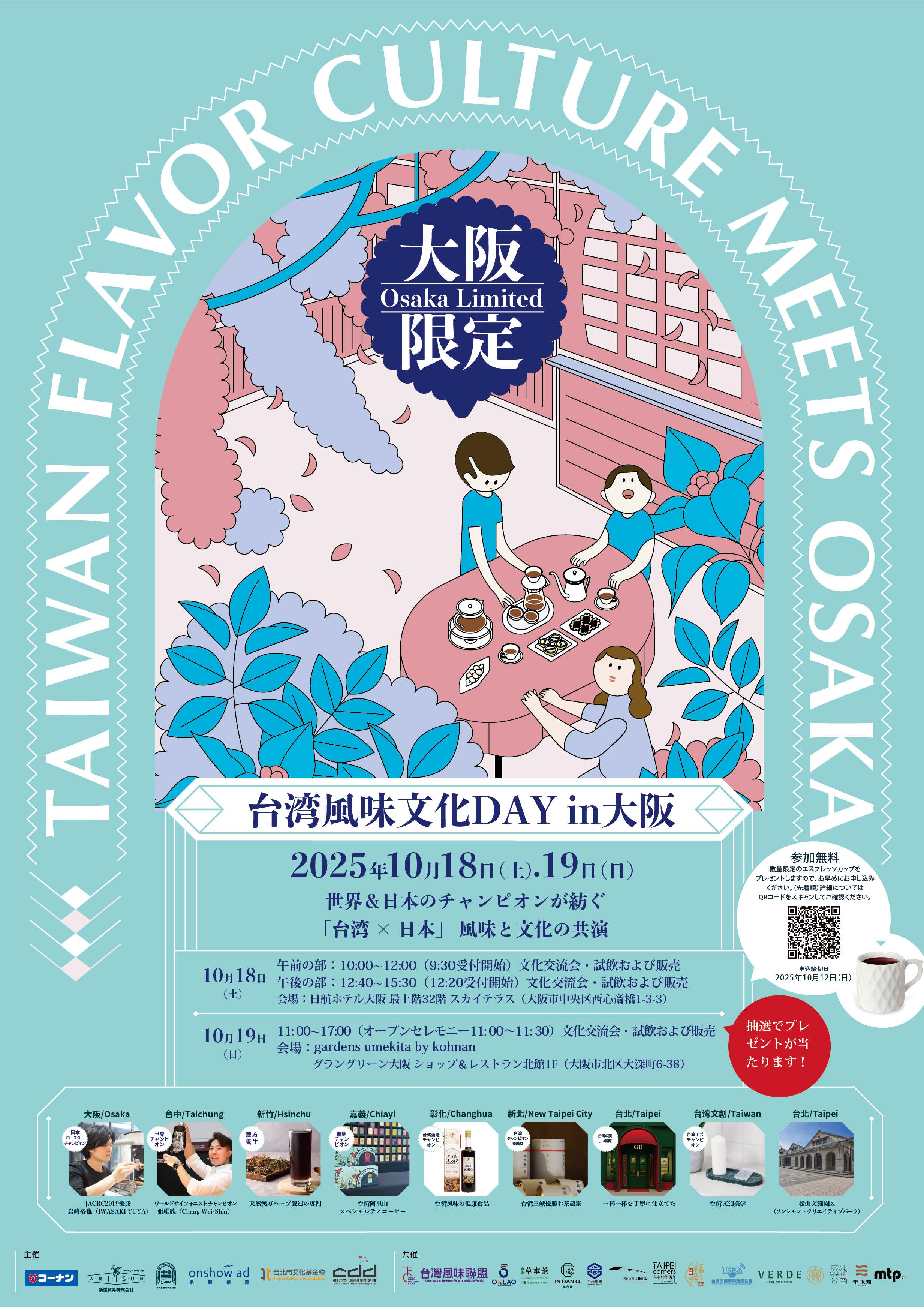「台灣風味聯盟」集結眾多代表性品牌共同組成,讓台灣品牌不再只是單點輸出,而是以群聚效應與品牌共鳴,打開日本市場與國際視野。10/18活動日將邀請世界咖啡冠軍張維欣、嘉義縣長帶領台灣最強產地阿里山咖啡莊園主、台灣風味連鎖飲料業者、台灣文創品牌等於大阪日航酒店32樓舉辦「台灣風味文化日VIP體驗會」;10/19日移師港南集團KOHNAN GARDENS UMEKITA舉辦台灣咖啡試飲會快閃活動,歡迎各界蒞臨交流!